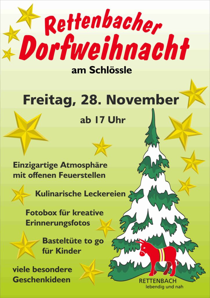 Am 28. November ab 17:00 Uhr findet wieder die traditionelle “Rettenbacher Dorfweihnacht” auf dem Schlössle-Vorplatz statt.