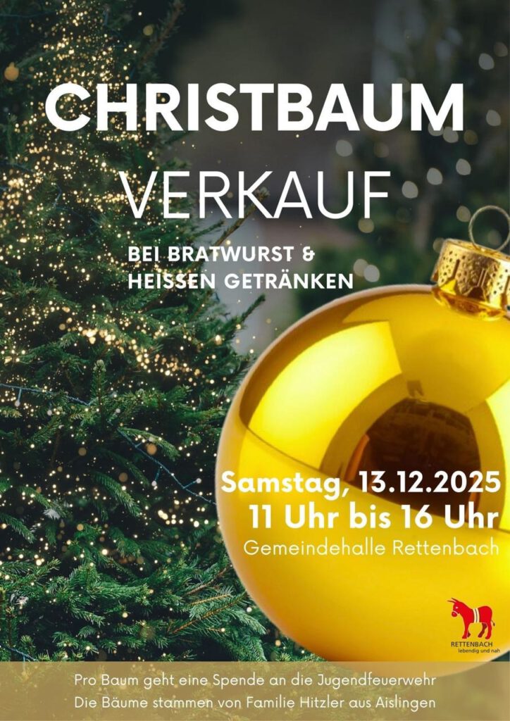 Am Samstag, den 13. Dezember 2025, findet von 11:00 bis 16:00 Uhr wieder ein Christbaumverkauf an der Gemeindehalle Rettenbach statt. Die wunderschönen Bäume stammen – wie bereits im vergangenen Jahr – von der Familie Hitzler aus Aislingen.